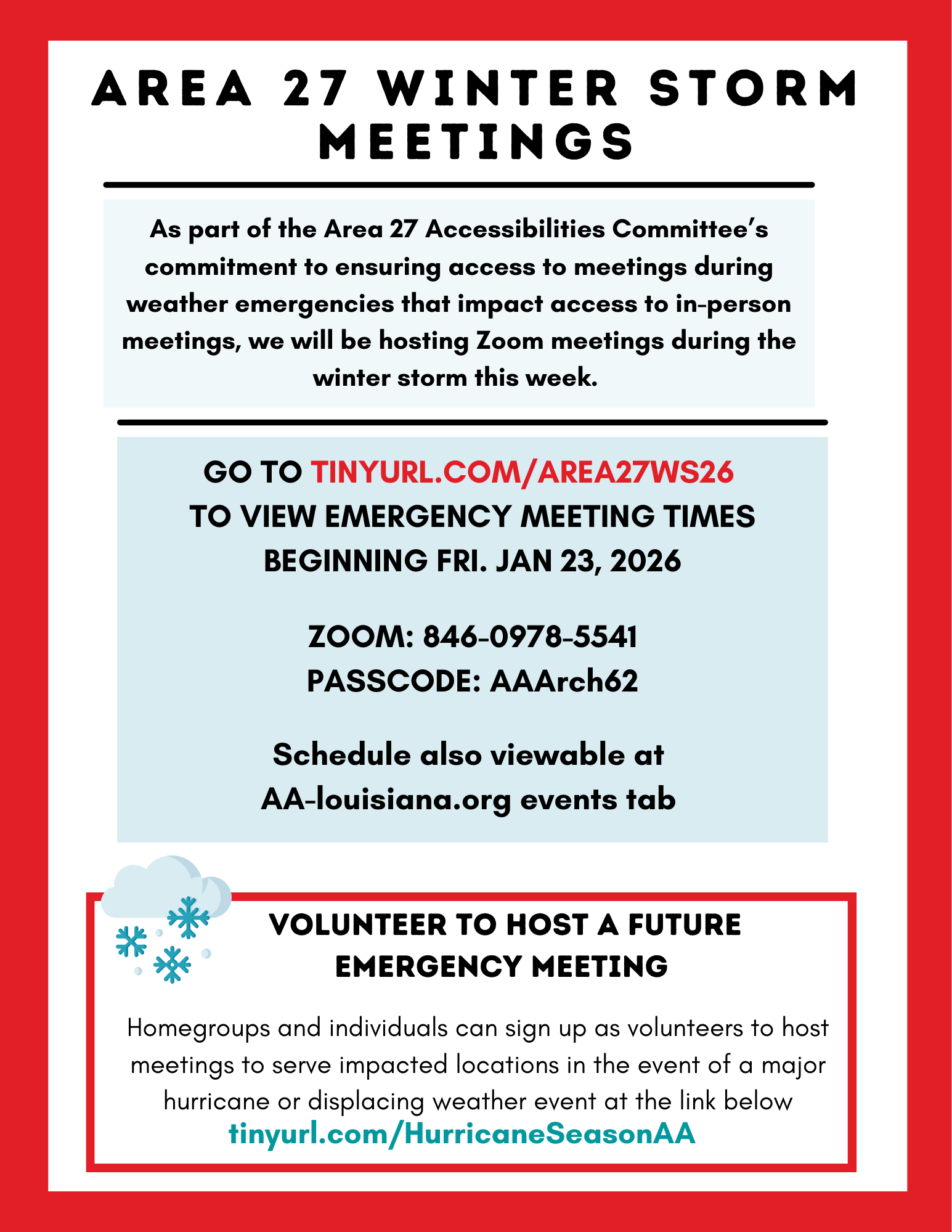 As part of the Area 27 Accessibilities Committee’s commitment to ensuring access to meetings during weather emergencies that impact access to in-person meetings, we will be hosting meetings on the Area 27 Zoom account during the winter storm beginning Friday, January 23, 2026. VISIT THE AA-LOUISIANA.ORG EVENTS TAB TO VIEW EMERGENCY MEETING TIMES BEGINNING FRI. […]
