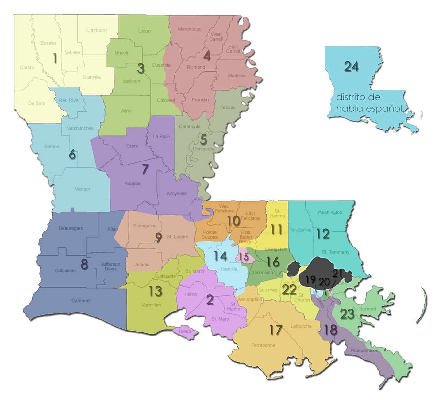 District 22: Between the Ascension Parish line at the north end and the La Fourche Parish line at the south, and between the Jefferson Parish line on the east side and the Assumption Parish line on the west. It includes all of St. James, St. John the Baptist and St. Charles parishes.