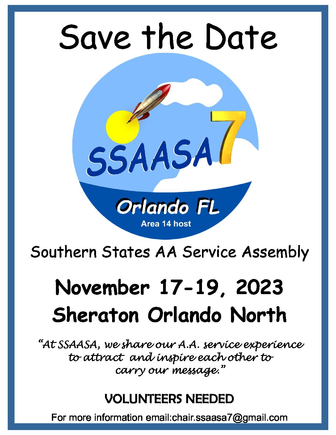 Save the date! SSAASA7 will be held in Orlando, FL hosted by Area 14 at the Sheraton Orlando North.